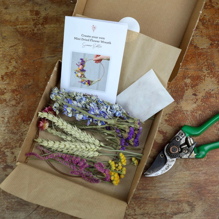 The Mini Summer DIY Wreath Kit is an excellent gift choice for craft lovers or anyone seeking an enjoyable and creative activity to do at home. These charming natural dried flower colours are set to brighten your day, featuring pinks, purples, yellow and blues.