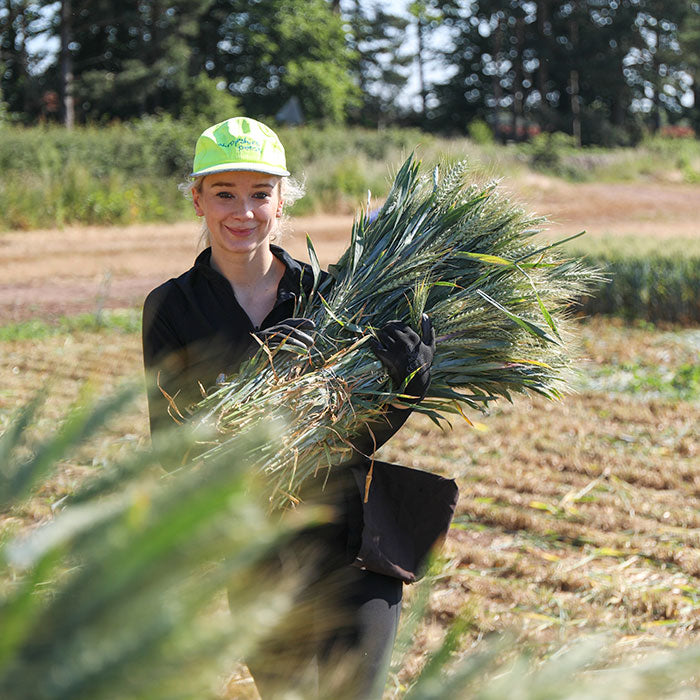 Grown on the farm here in our Shropshire fields. We grow wheat during the summer time and harvest it when it's at it's peak, then carefully place it on giant stillages and dry it here on the farm. We then send it out all year around from our Petal shed.