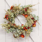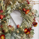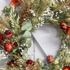 A handmade Christmas themed dried flower wreath for your home this festive season. Green, red and golden tones, perfect for a traditional Christmas wreath.