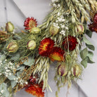 Beautifully put together using dried flowers, wheat and oats from the Shropshire Petals farm. This wreath features nigella pod, gyp, lepidium, helichrysum and eucalyptus.
