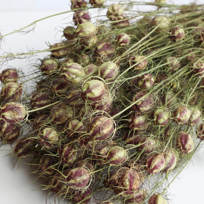 Nigella Pod is also known as 'Love in the Mist'. It features greens and hints of a mulberry colour too.