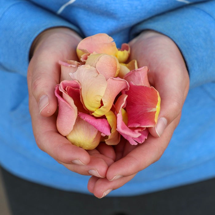 Multi-tonal dried rose petals that feature orange, peach and coral coloured tones.