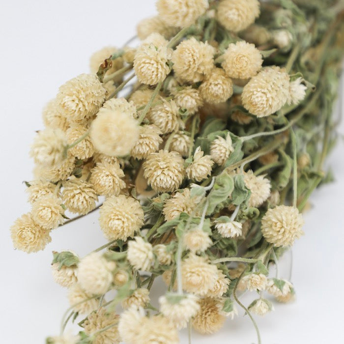 A dried flower bunch of creamy lemon coloured Gomphrena.