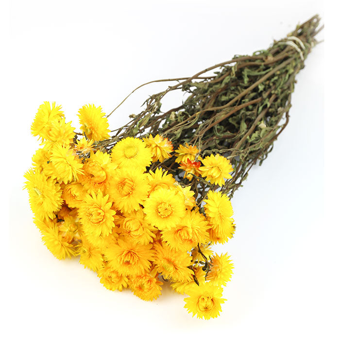 This wonderful dried flower features bright yellow flower petals that feel like paper to touch. They make a bold statement to any floral arrangement. There is a wonderful variation in colour across the flower heads.