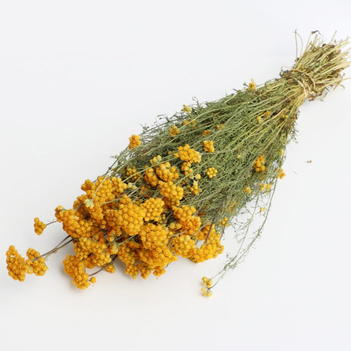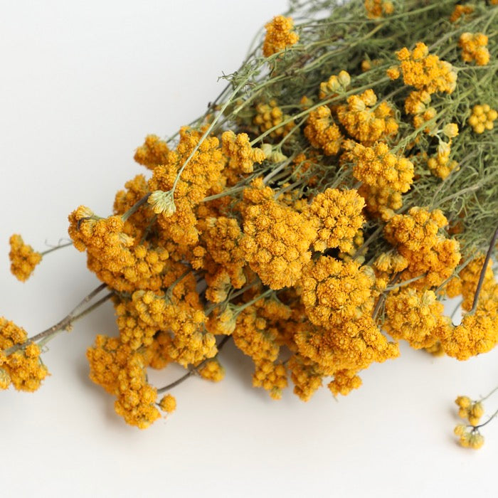 A cheerful and bright dried bunch of yellow Lonas flowers.