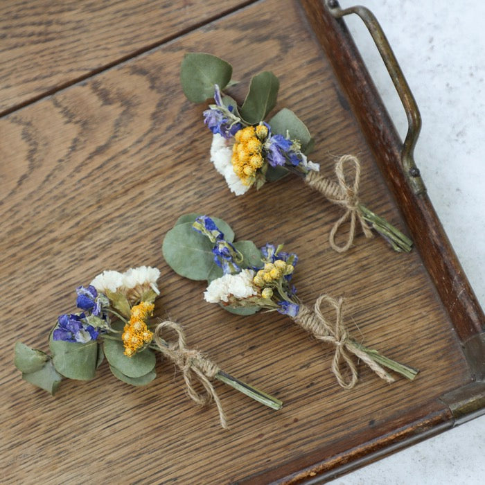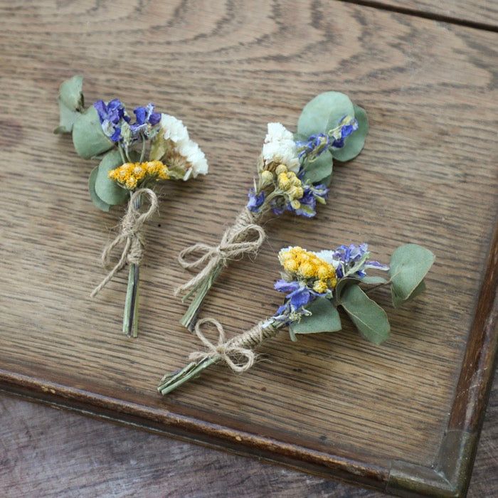 A pack of 3 Springtide buttonholes made from real dried flowers, featuring yellows, blues and cream tones.