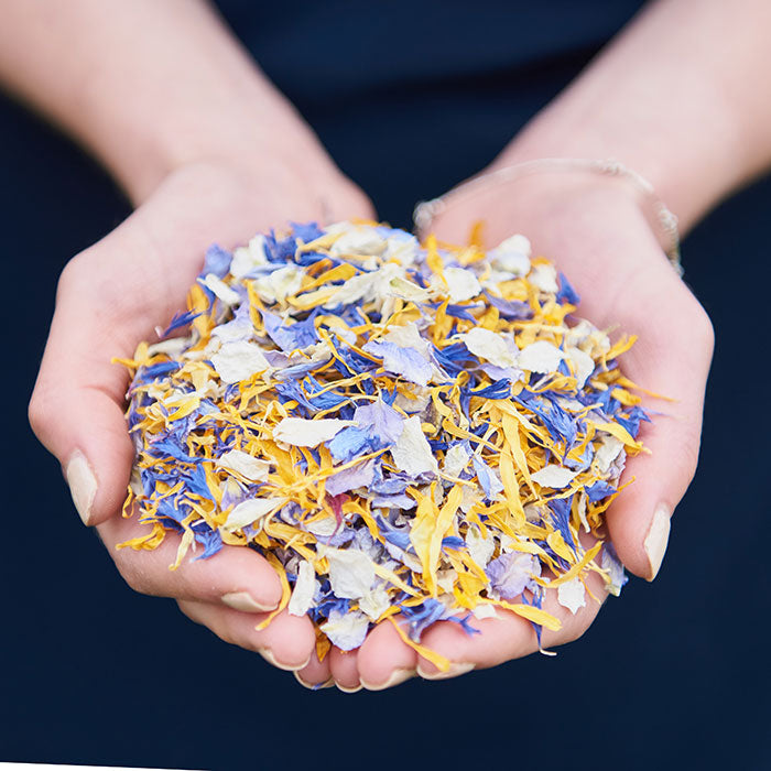 This popular mix is a combination of Icing Sugar, Honey B', Frosted Blue and Blue Bird petals which are delphiniums, cornflowers and calendula grown on the Shropshire Petals farm.