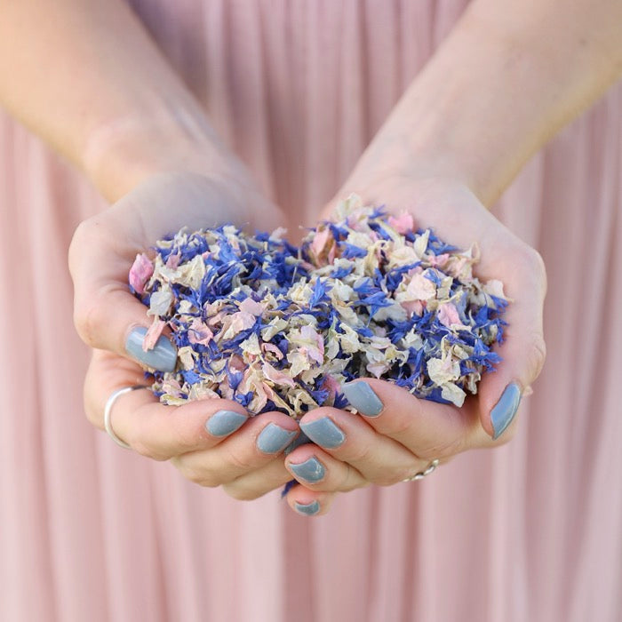 This mix was created by popular demand. It's a combination of Icing Sugar, Candy Floss and Blue Bird petals which are delphiniums and cornflowers grown on the Shropshire Petals farm.