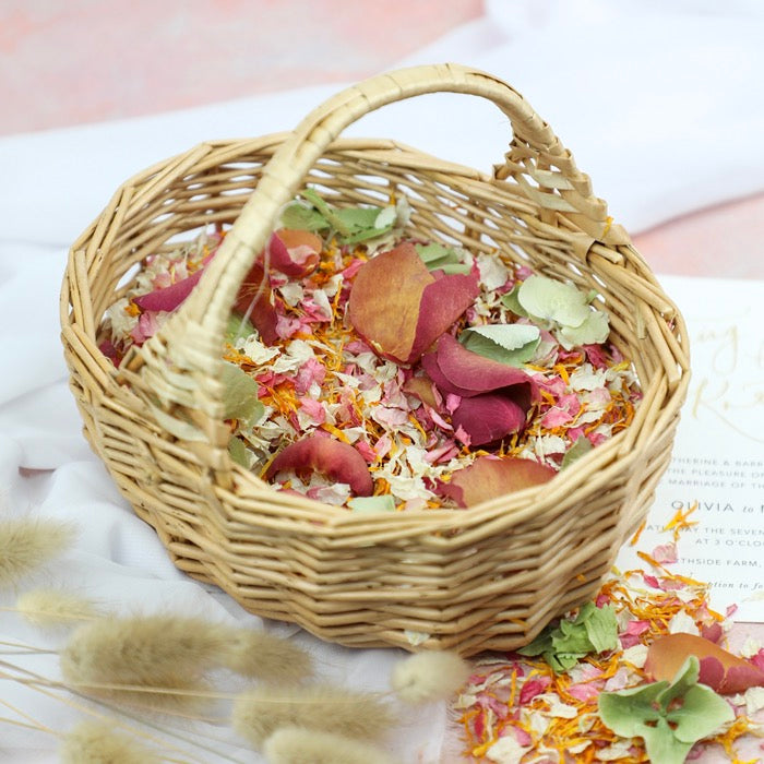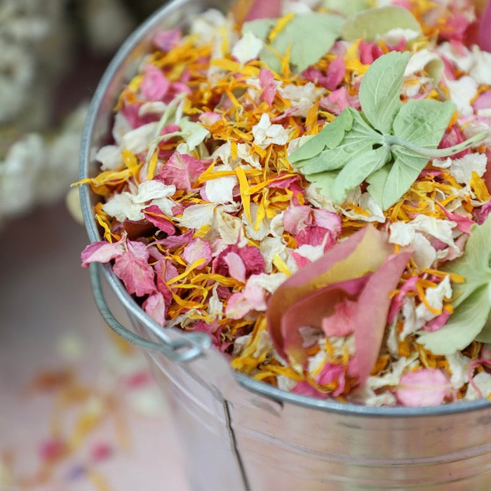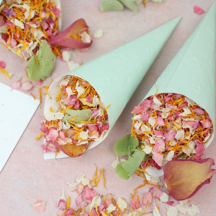 Handpicked and naturally dried with expert care, the mix includes Icing Sugar and Cherry Blossom delphinium petals, Honey'B calendula petals, Clementine rose petals and Envy green hydrangea petals. Every petal is natural, dye free and fully biodegradable, making this confetti as kind to the environment as it is beautiful.