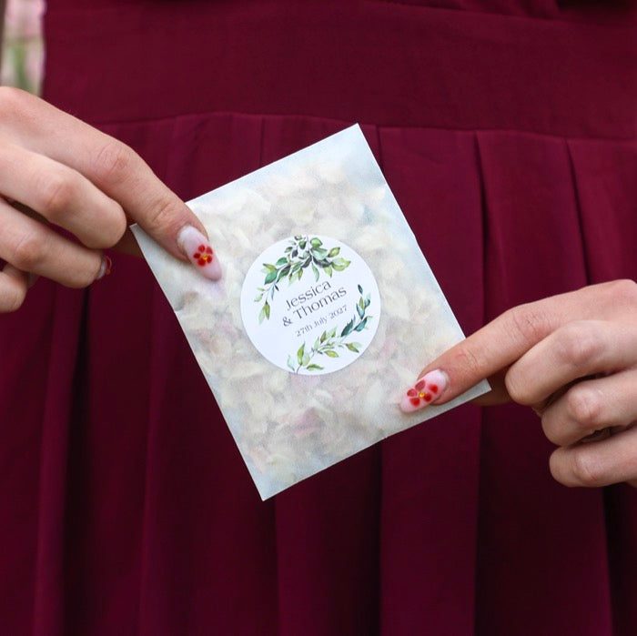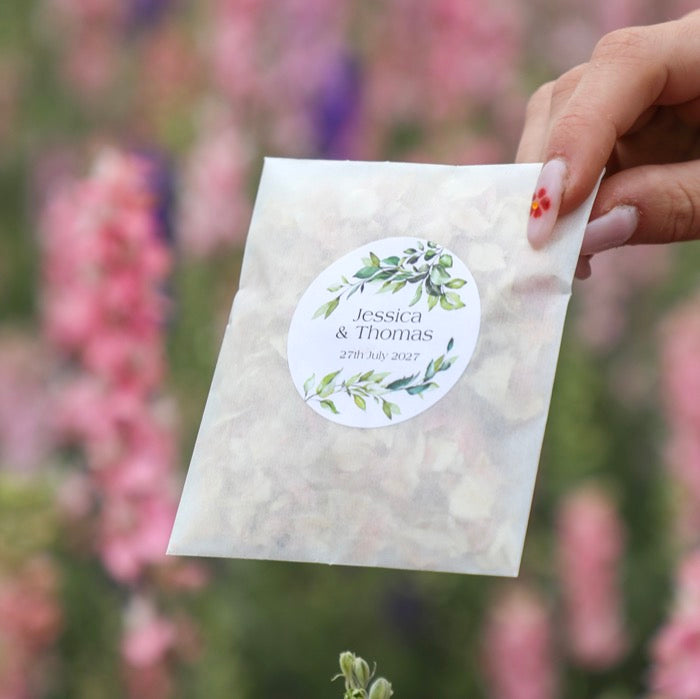 These adorable personalised sachets come filled with your choice of biodegradable petal confetti grown on the Shropshire Petals farm. Each sachet holds an individual handful of eco-friendly petal confetti.