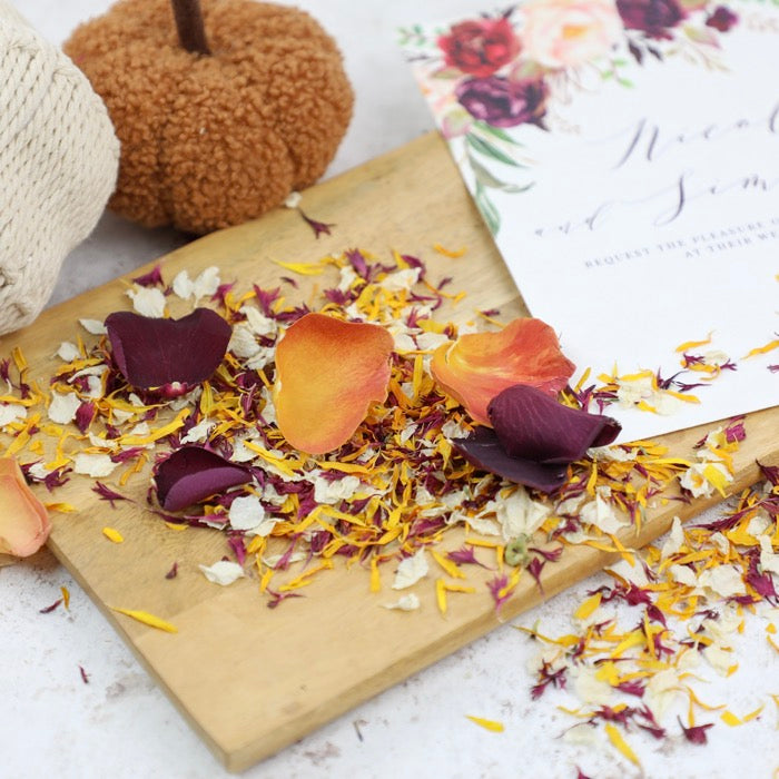 Perfect for throwing over the newlyweds, scattering down the aisle or styling across your reception tables, this autumn inspired mix brings warmth and romance to your celebration.