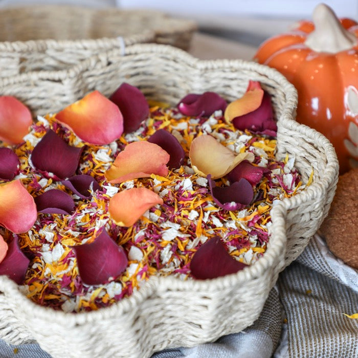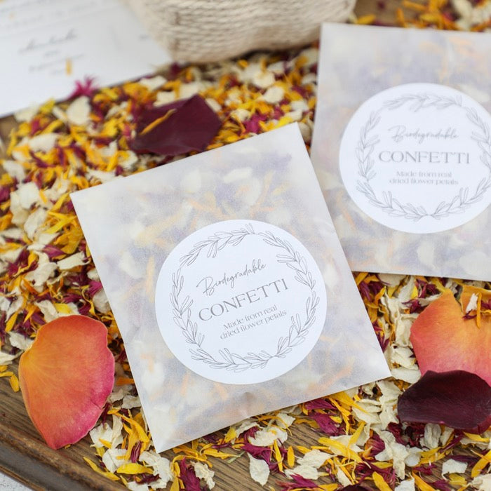 Handpicked and dried with expert care, this blend features Icing Sugar and Cherry Blossom delphinium petals, Honey'B calendula petals, and luxurious Burgundy and Burnt Orange rose petals. Every petal is natural, dye free and fully biodegradable, making this confetti as kind to the environment as it is beautiful.
