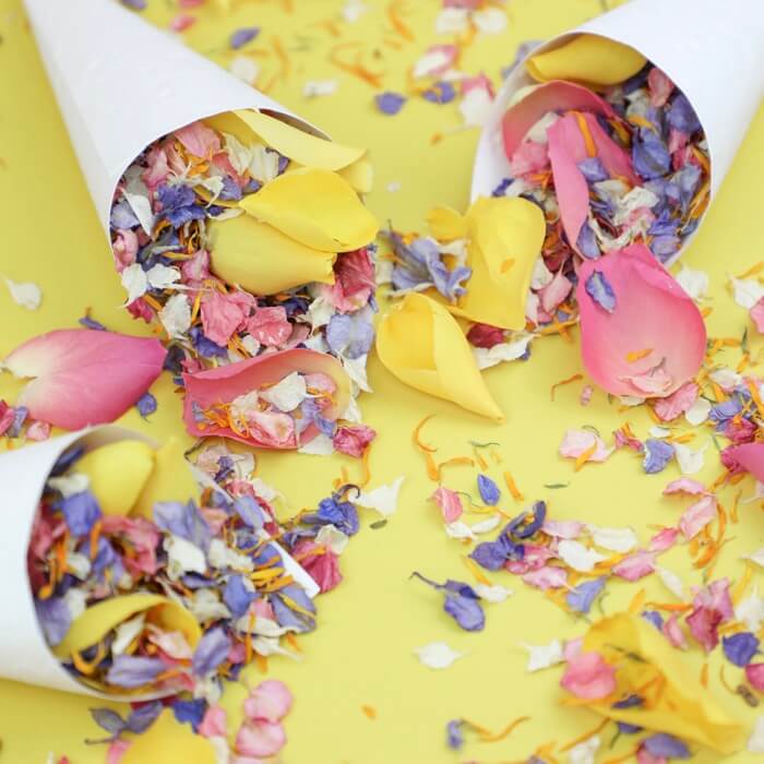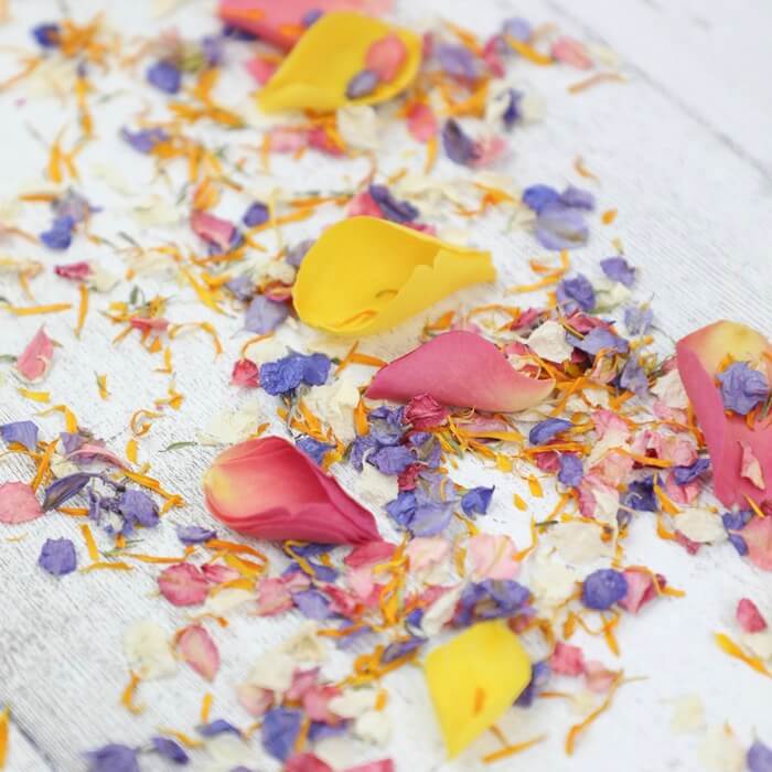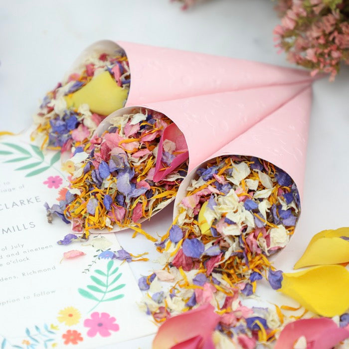 Handpicked and naturally dried with expert care, the mix includes Icing Sugar, Amethyst and Cherry Blossom delphinium petals, sunny yellow Honey B' calendula petals, Flamingo Pink and Golden Slumber rose petals. Every petal is natural, dye free and fully biodegradable, making this confetti as kind to the environment as it is beautiful.