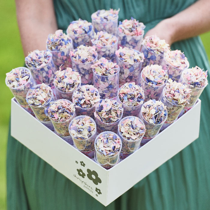 25 Confetti Pops filled with your choice of flower petal confetti, all displayed in a beautiful box with trays to hold your Confetti Pops in place.
