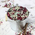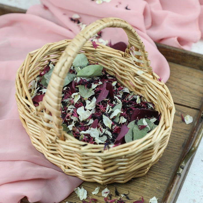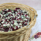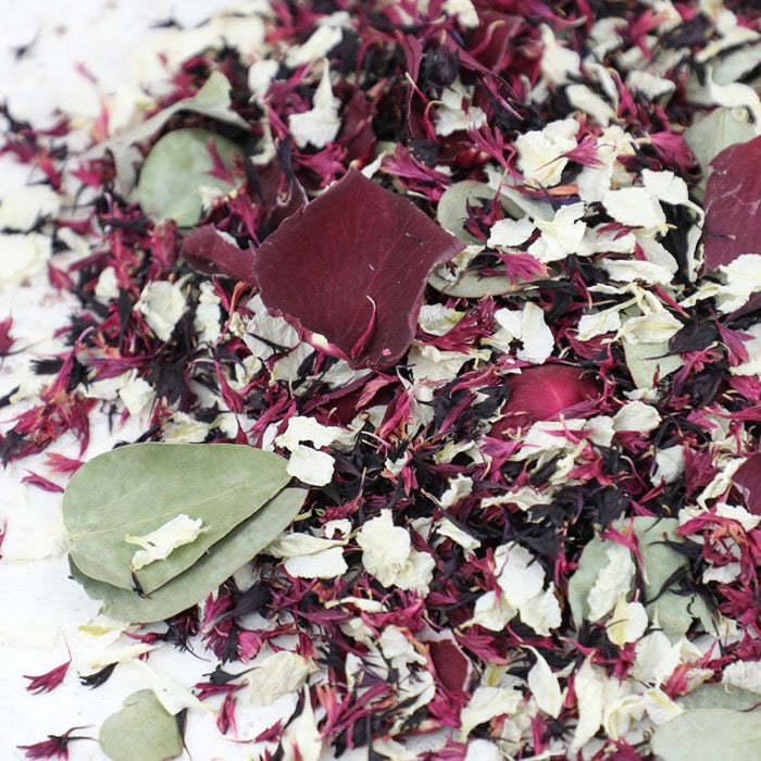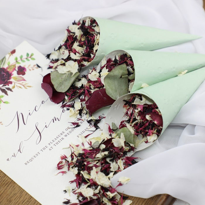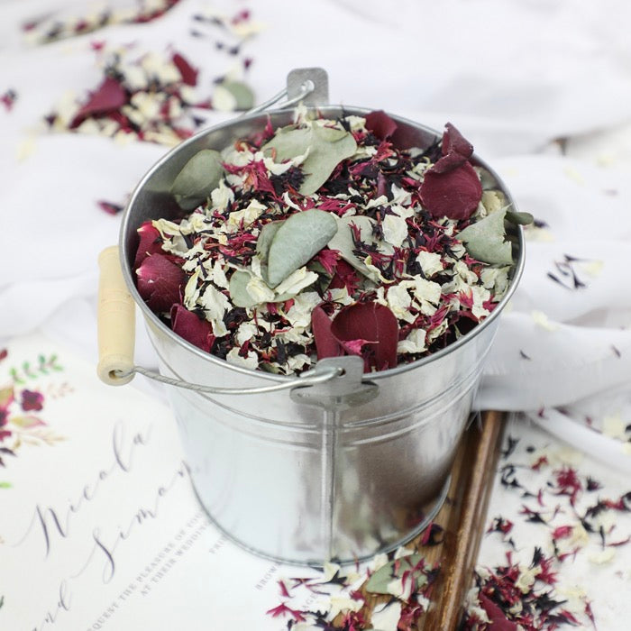 This biodegradable confetti mix is a blend of Icing Sugar delphinium petals, Burgundy Berry and Black Tie cornflowers, Eucalyptus leaves and our Burgundy rose petals. The ultimate sustainable wedding confetti mix.