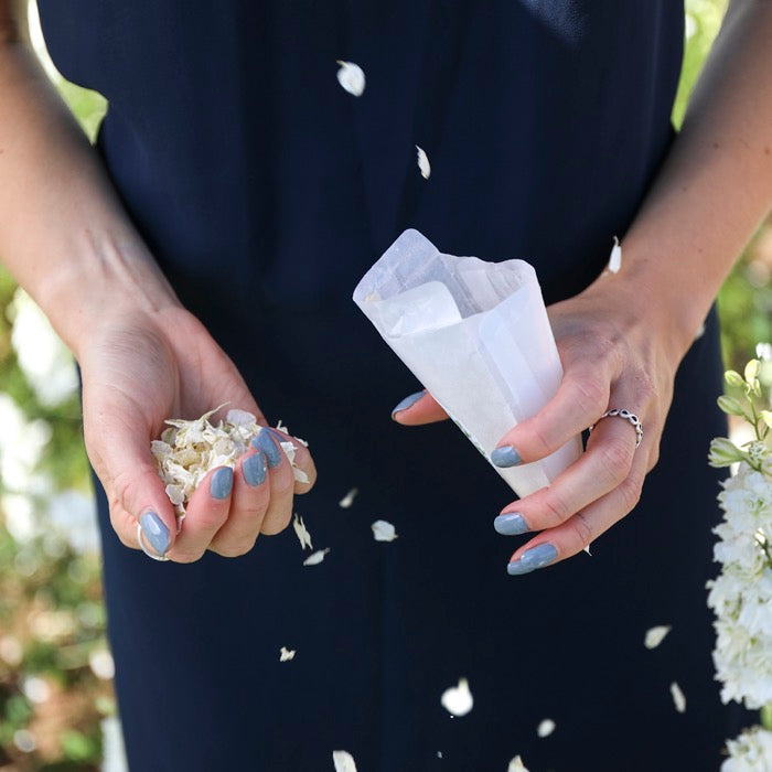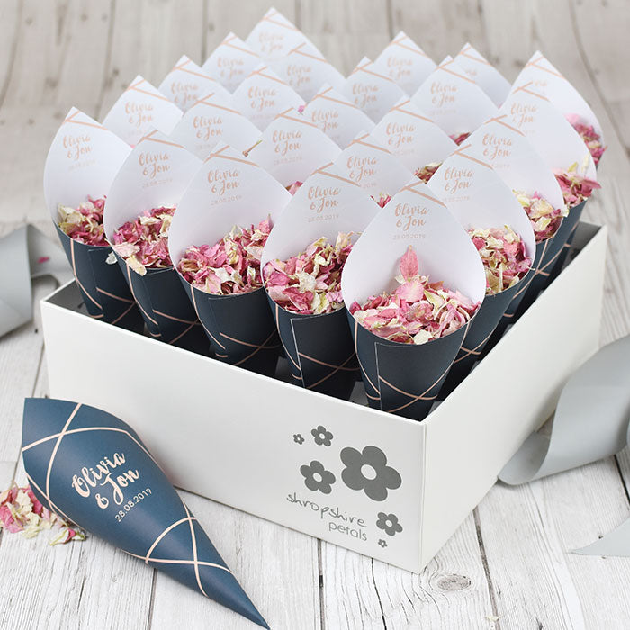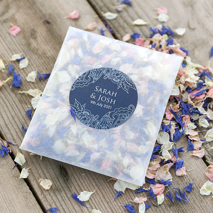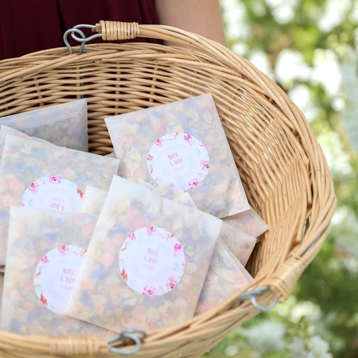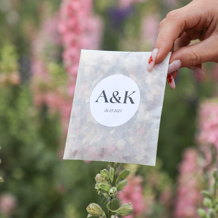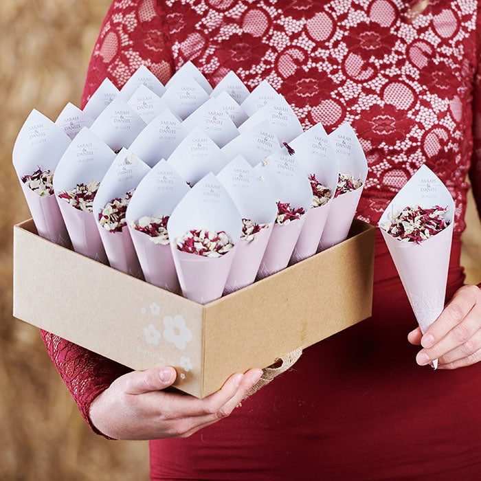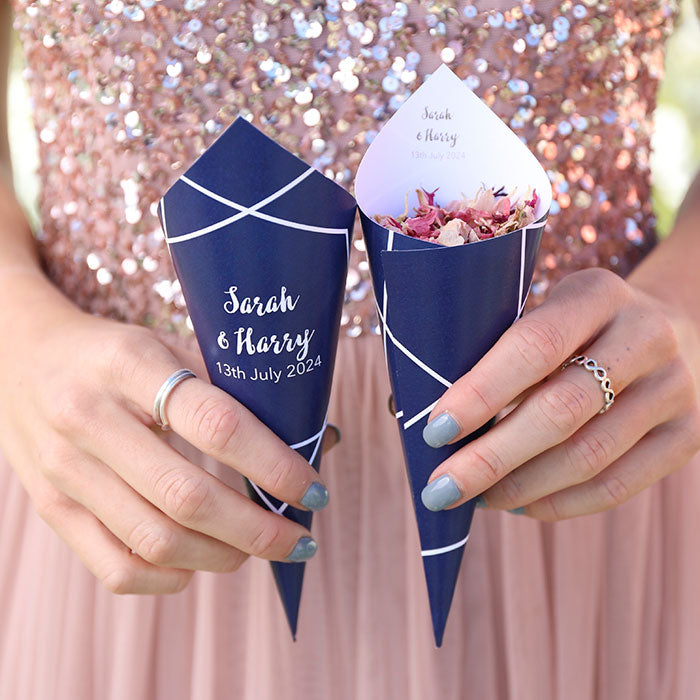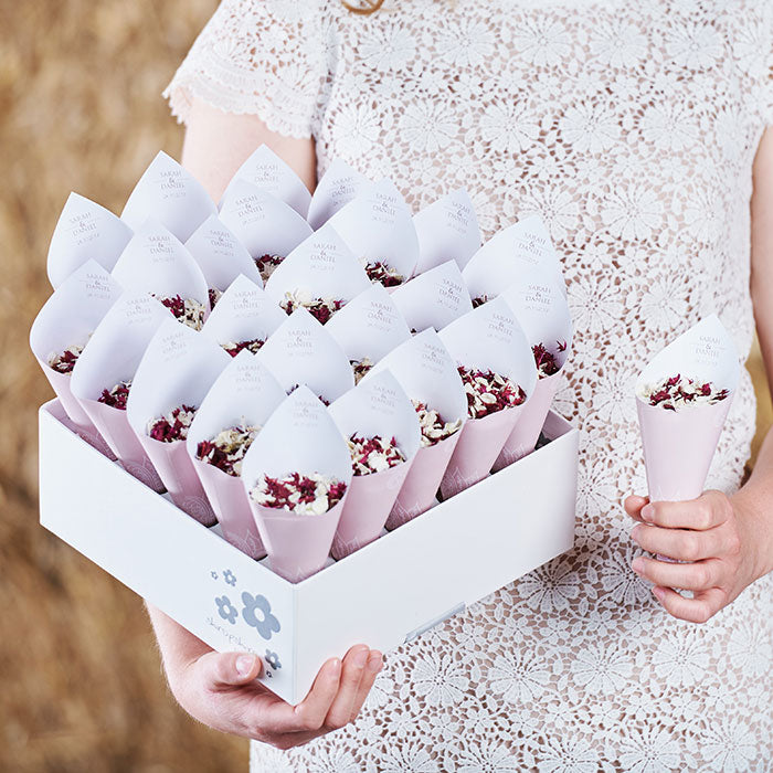 Add a personal touch to your wedding confetti with our range of sachets, pops and cones. Add your names and even change the background colour to match your wedding scheme and biodegradable petal colour choice.