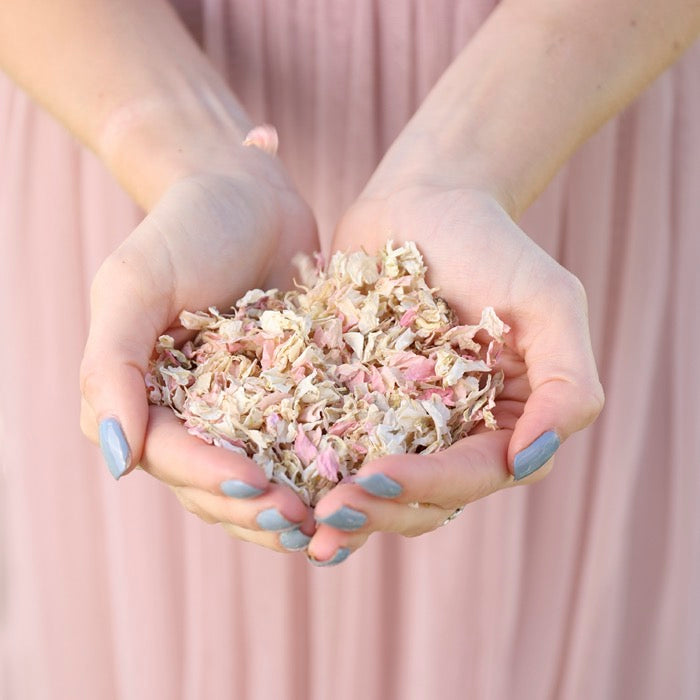 This popular mix is a combination of Icing Sugar and Candy Floss petals which are delphiniums grown on the Shropshire Petals farm.
