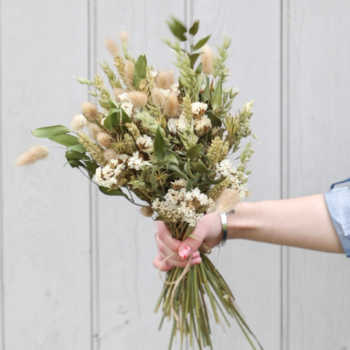 A charming handmade Woodland Bouquet, made with quality dried flowers, direct from the Shropshire Petals farm. Featuring white, green and golden tones.