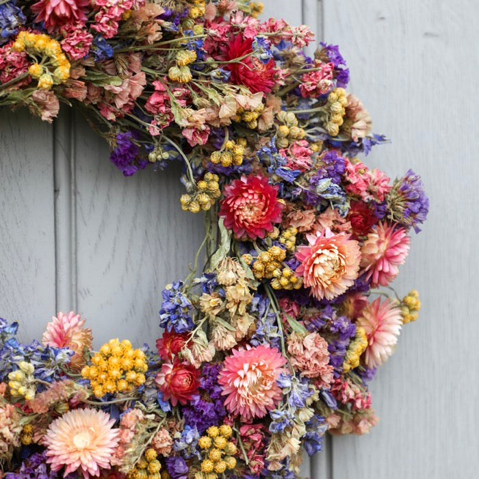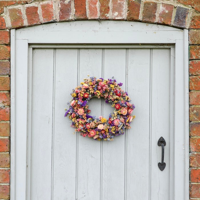 A cheerful and colourful handmade dried flower wreath, grown and made on our Shropshire farm.