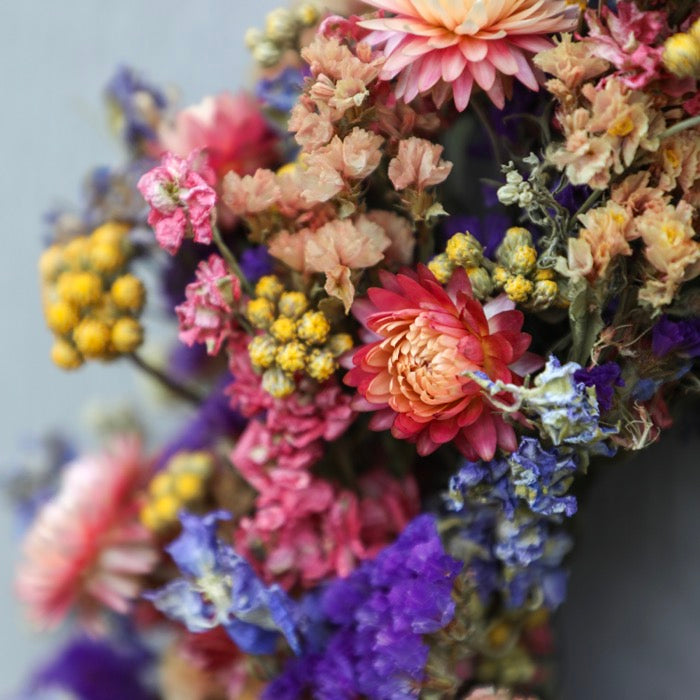 This beautiful wreath features a mixture of different dried flowers including larkspur, statice, lonas and helichrysum.